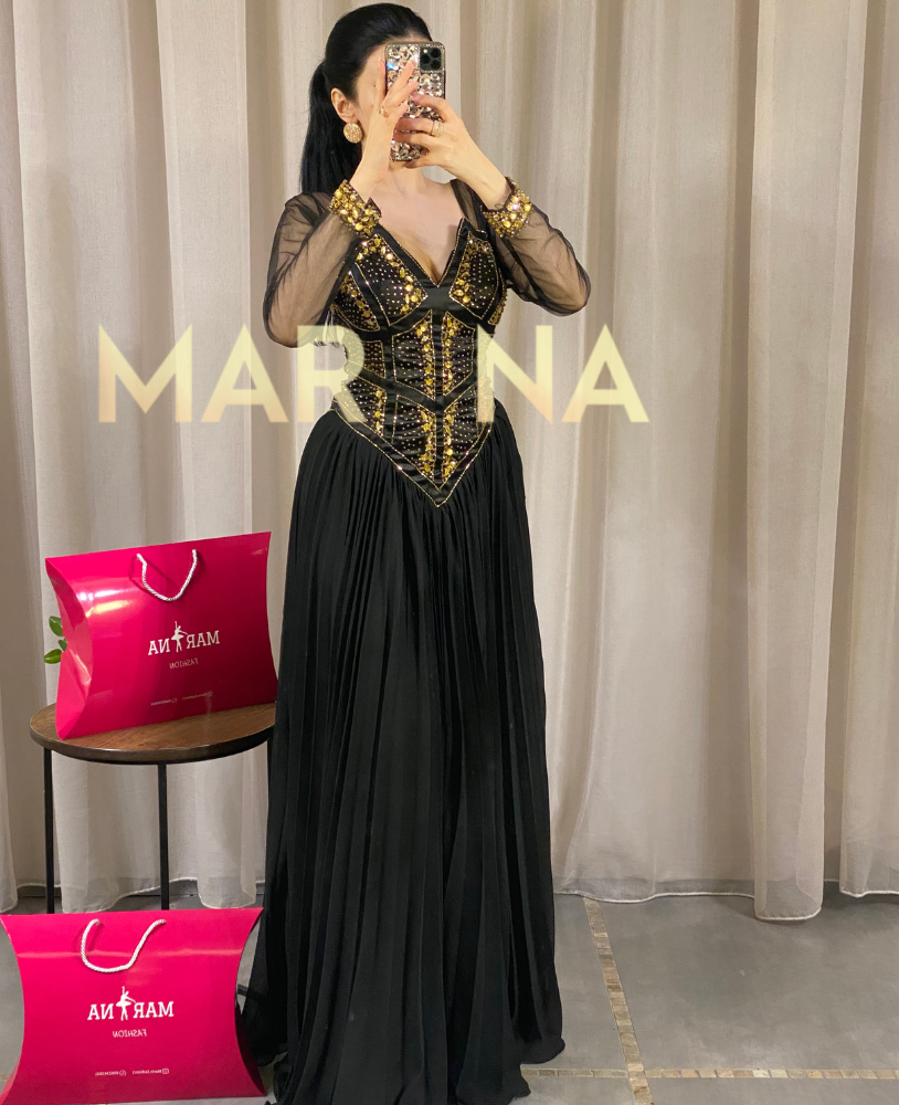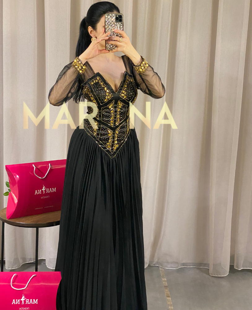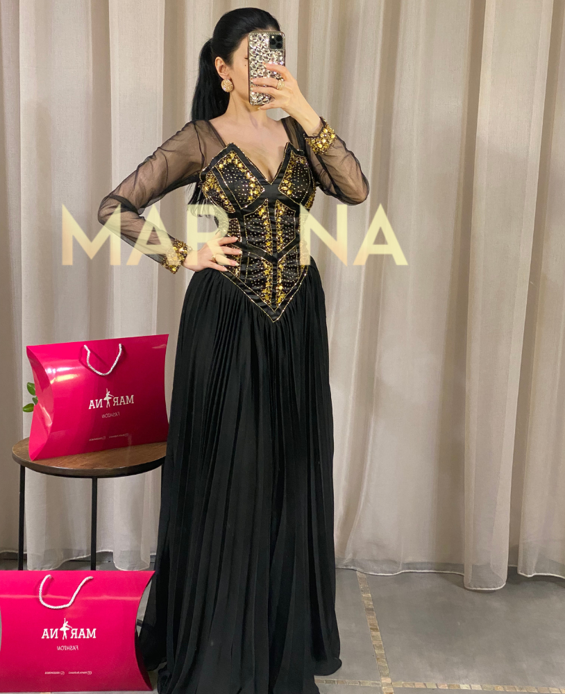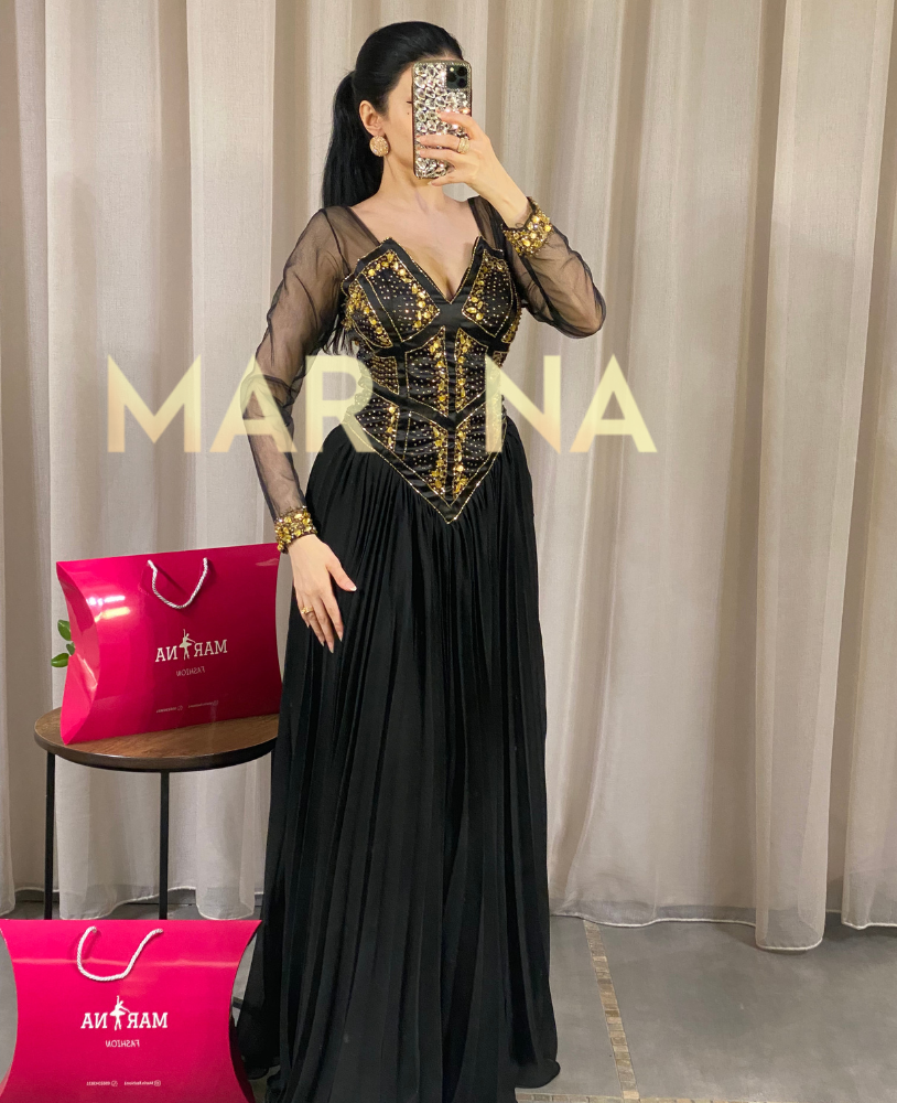ارتقي بإطلالتك مع فستان إلينا الذي يأتي بلون أسود جذاب ويتميز بتطريز فاخر مُقدم لكن من متجر Marina Fashion