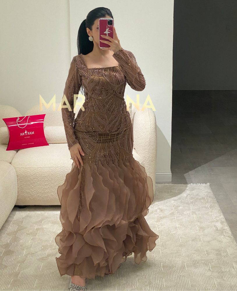 فستان دارينا (فستان موكا كلفه شك سهره وكسرات جزار) يجمع بين البساطة والجمال في تصميم واحد مُقدم لكن من متجر Marina Fashion